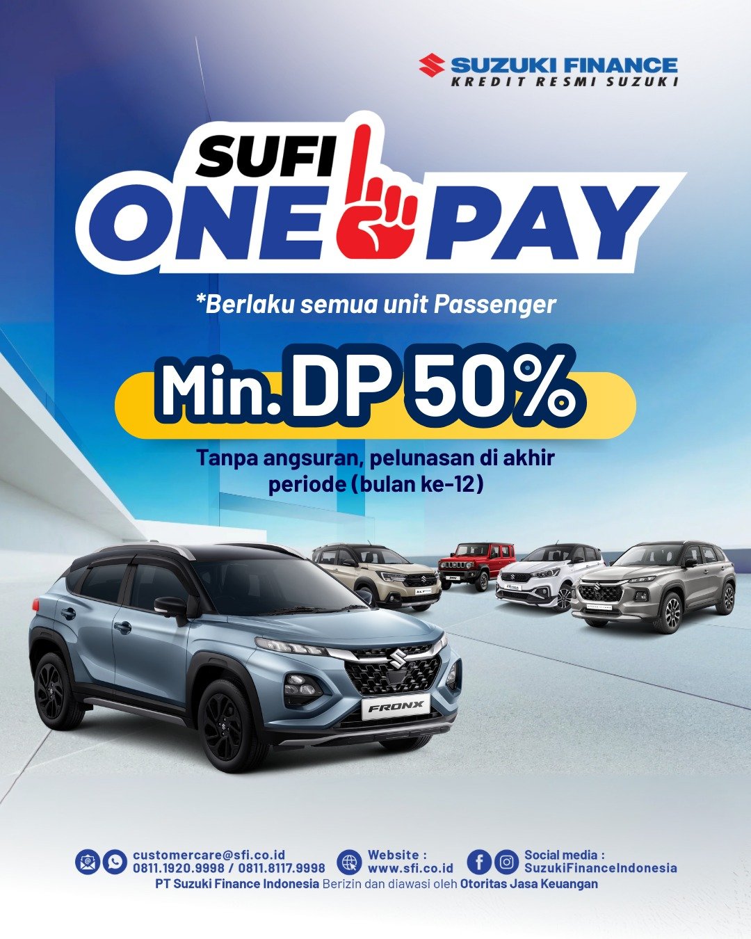 Suzuki Finance Indonesia menghadirkan program spesial SUFI ONE PAY yang memberikan kemudahan bagi Anda yang ingin memiliki mobil Suzuki impian tanpa perlu repot cicilan bulanan. Melalui program ini, Anda cukup membayar DP (Down Payment) minimal 50%, kemudian melunasi sisanya di akhir periode (bulan ke-12).
